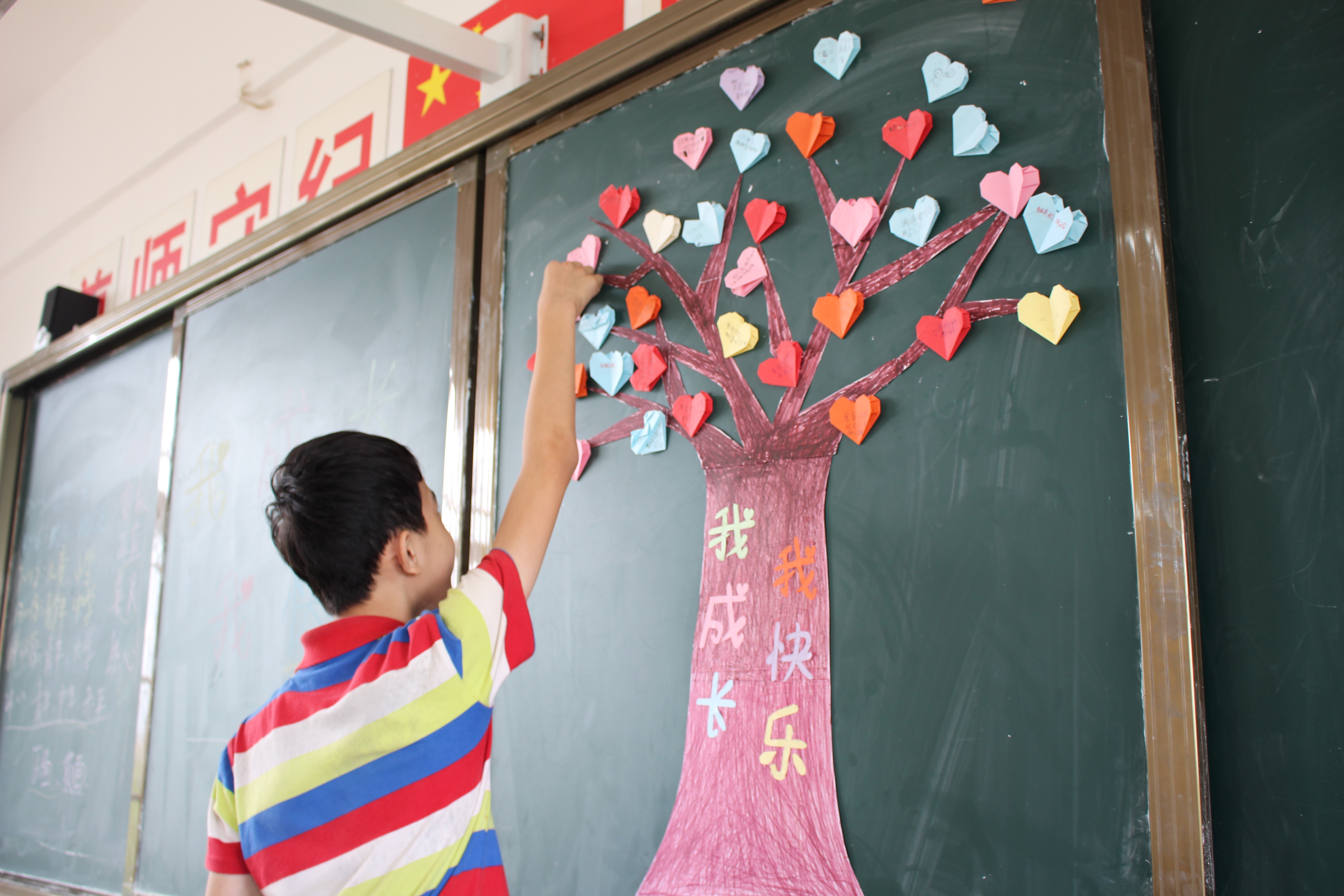 小班和中班以“感恩”为主题,采取讲故事和做游戏的方式开展。在游戏过程中,感恩的观念深入到孩子心中。大班采取多种形式,引导孩子们将理论与实践相结合,取得了良好的效果。第一环节,由国学组蔡文科对“我成长,我快乐”主题进行细致讲解,联系现实生活进行了基本的心理方面的知识科普。第二环节,由工艺组纪晓娜教授大家折爱心,然后每个学生爱心上写下对老师、父母等想说的话,由孩子们将折好的爱心贴在“七彩树”上。第三环节,组织孩子们一起打扫教室卫生,引导孩子们动手实践、爱护卫生。