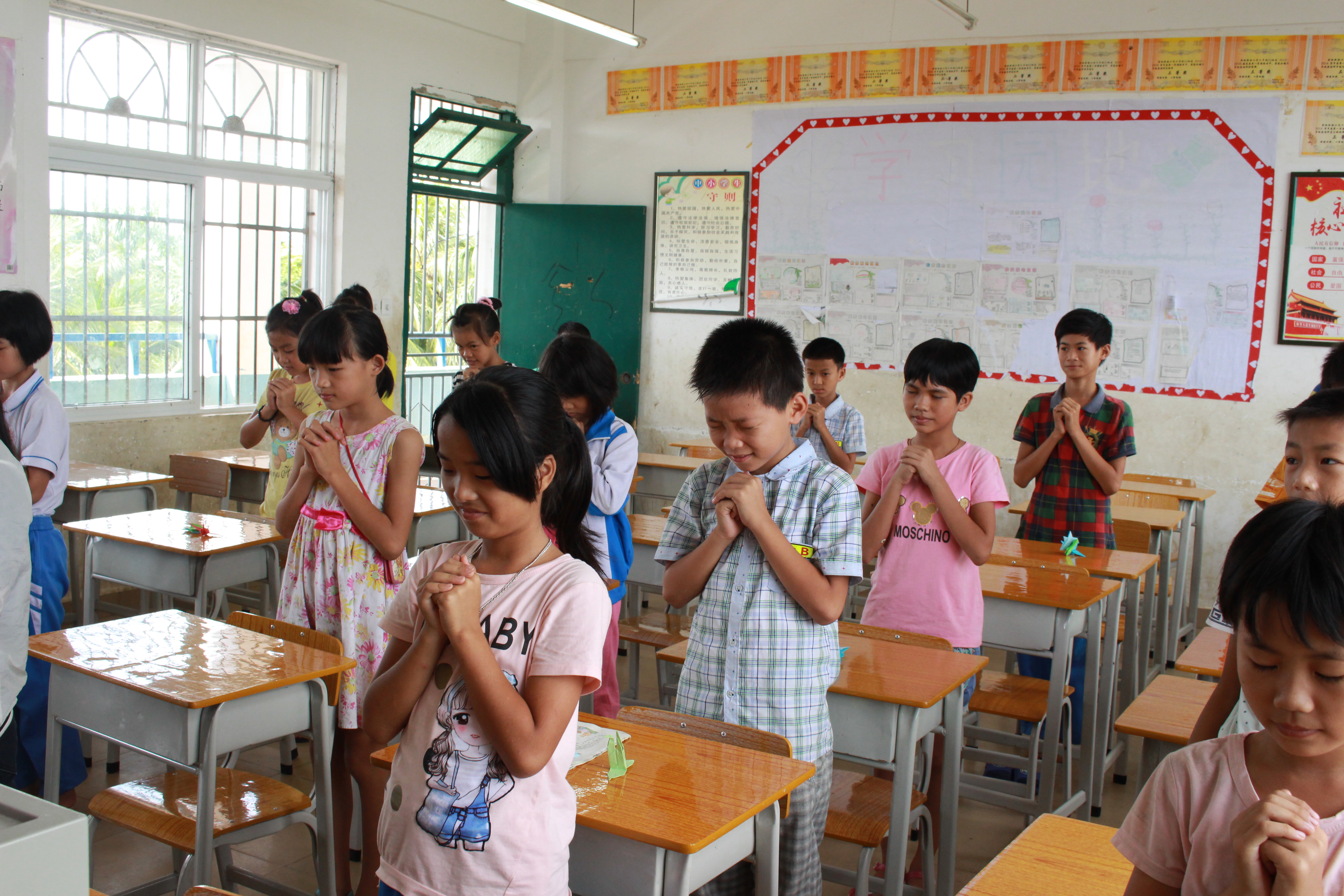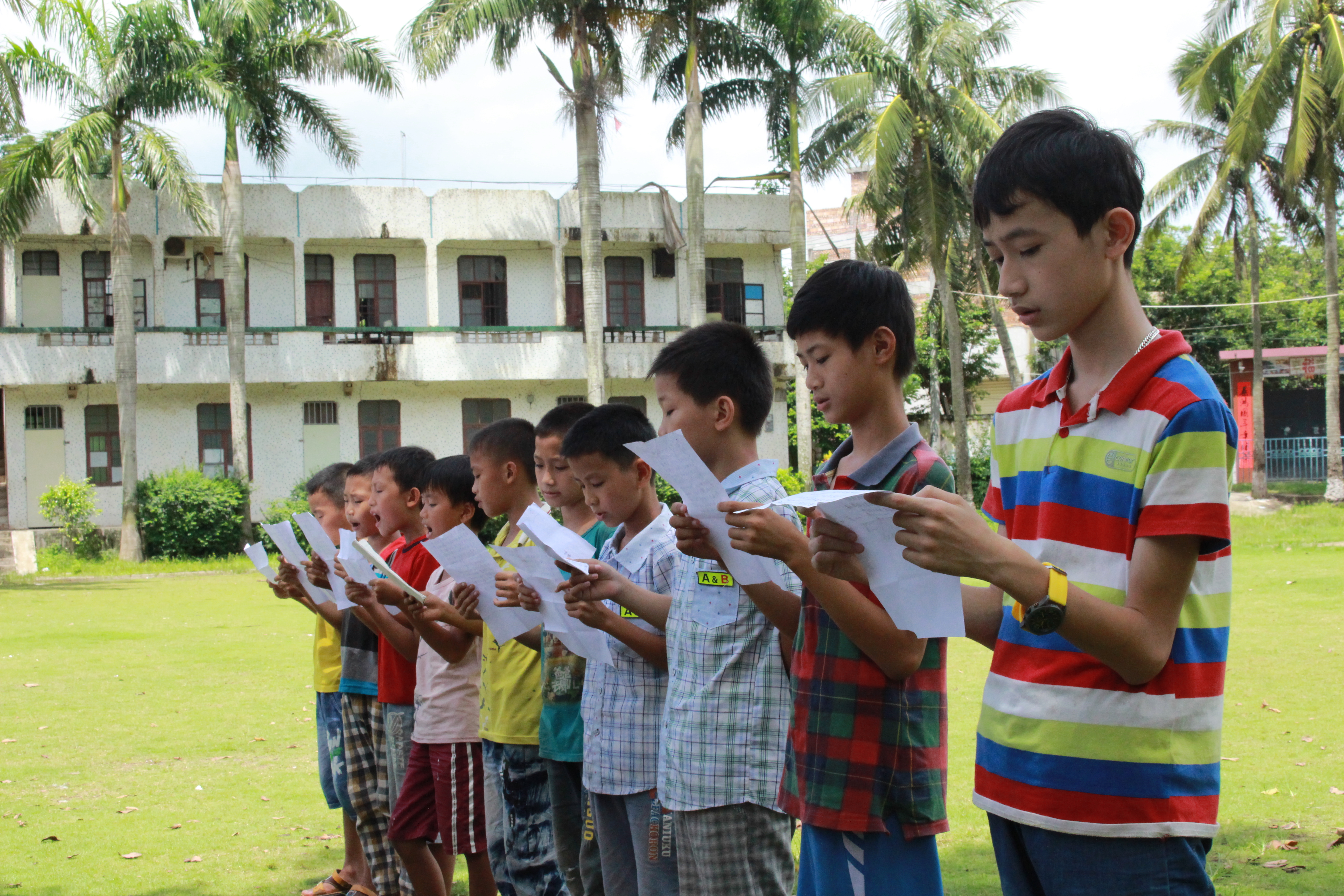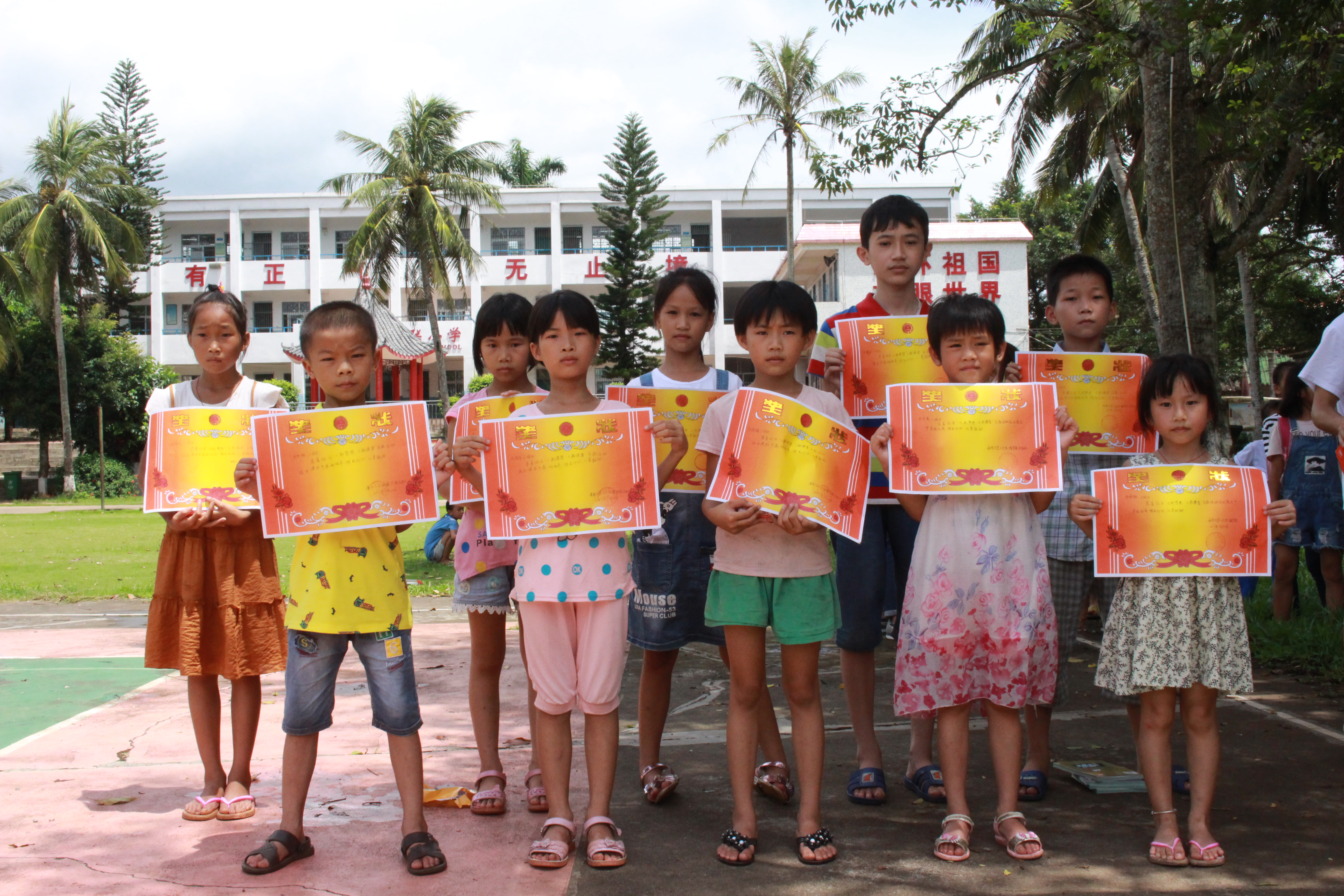 上午,志愿者们像往常一样为孩子们进行帮教活动。作为最后一天的支教,工艺组教授孩子们折千纸鹤、爱心等手工作品,音乐组教孩子们演唱《小白船》、《童年》等歌曲,课堂上满满的都是感动和温馨。随后,支教队则以主题班会的形式进行禁毒知识讲解,分别从“是什么、为什么、怎么办”三个方面并且联系现实生活进行了基本的戒毒方面的知识科普。让孩子们了解有关毒品的常识、充分认识毒品的危害,提高拒毒防毒意识,从而远离毒品。接着,共青团海口市委机关干部表达了对孩子们的期许,所有老师及志愿者们为孩子们分发了图书,并合影留念。最后,孩子们分别进行了大合唱、舞蹈表演、诗歌朗诵、手语操《我们都一样》等节目表演。表演结束后,支教队员们为孩子们颁发了奖状和学习用品。此次暑期社会实践支教在大家欢声笑语中顺利落下帷幕。