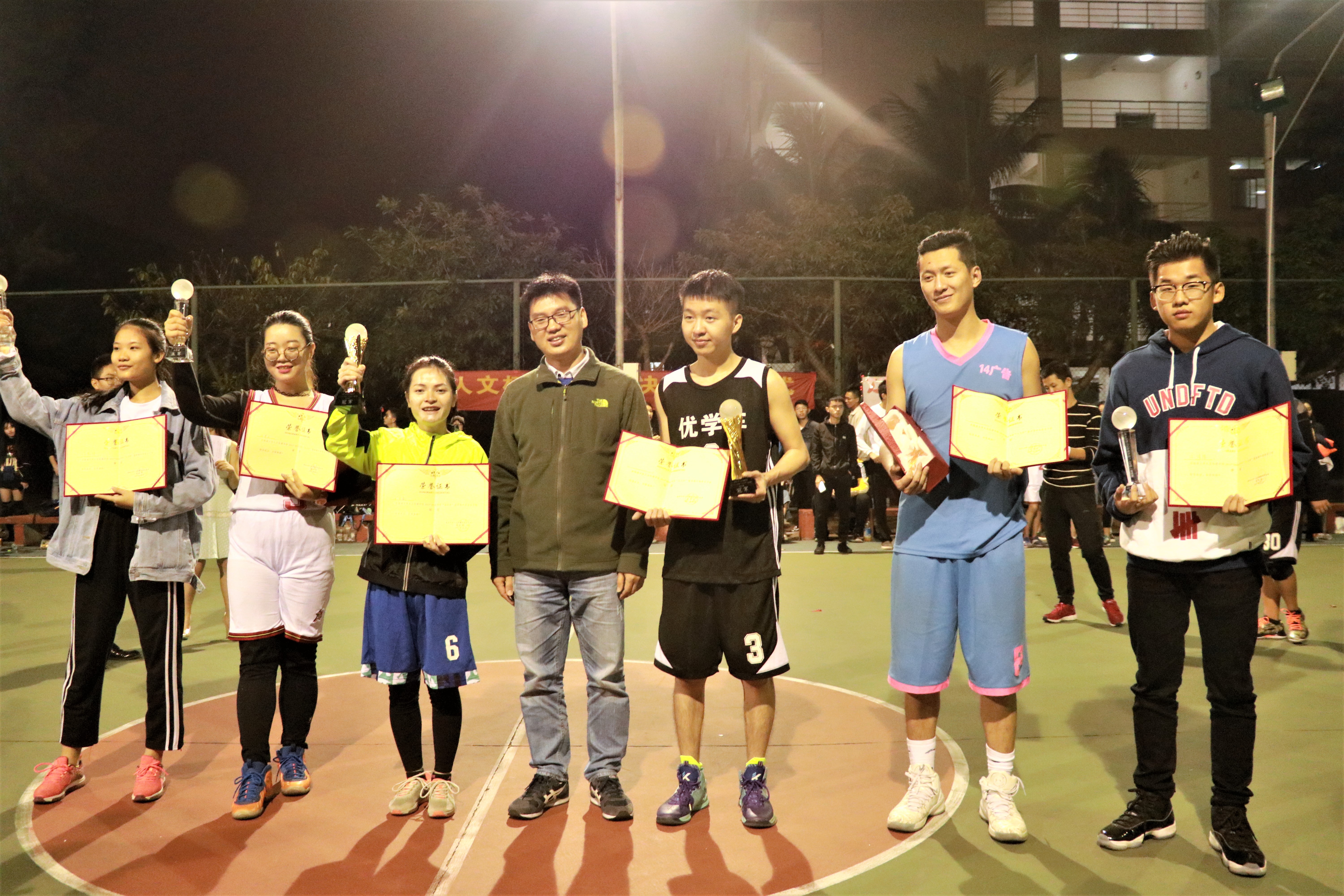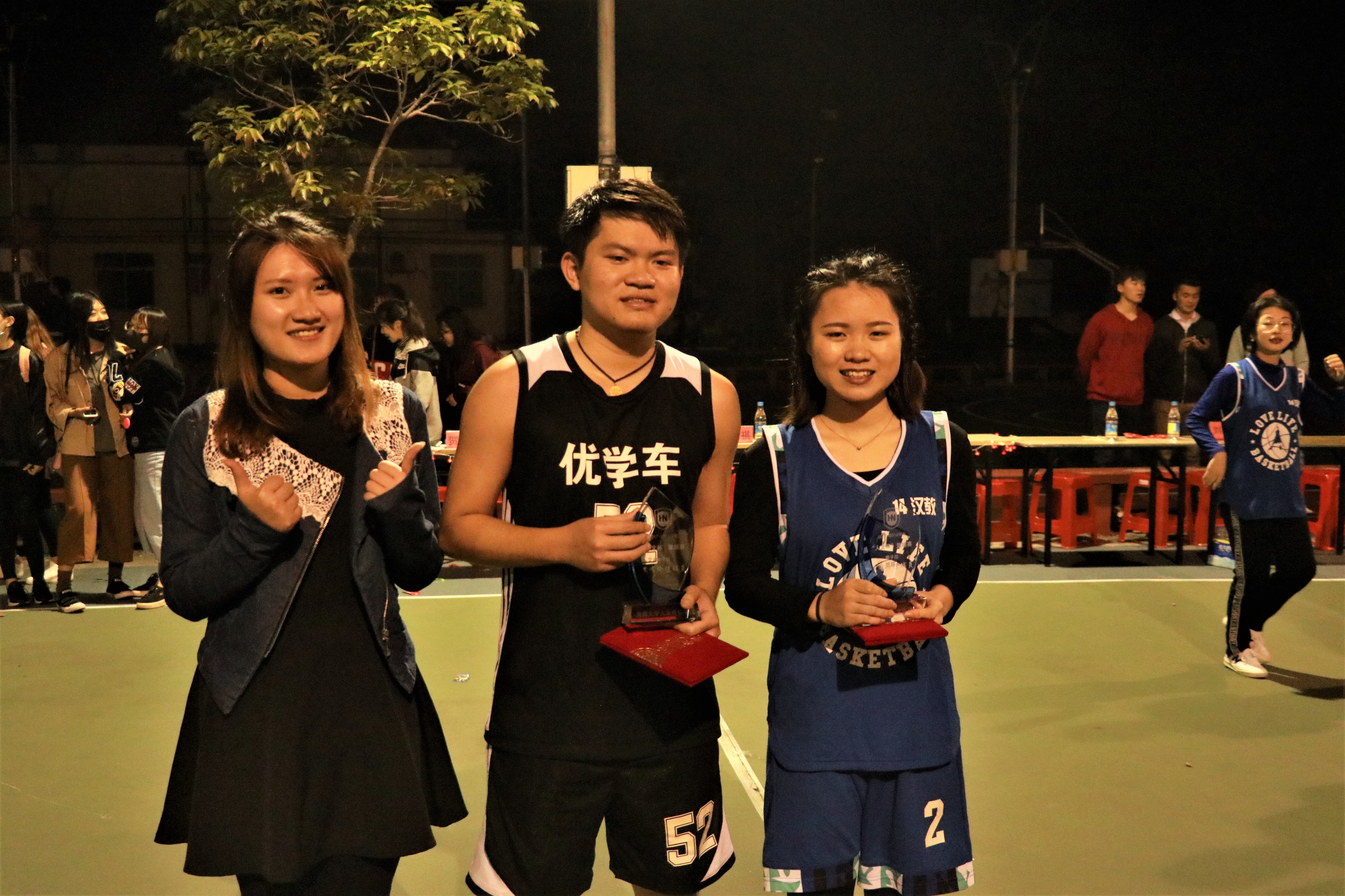 至此,比赛已至尾声,结果也已出炉。颁奖仪式随即举行,主持人宣布比赛结果。由熊文军老师和魏有美主席分别为冠亚季军及最有价值球员颁奖并合影留念。至此,人文传播学院2017年“人文杯”篮球赛圆满落幕。