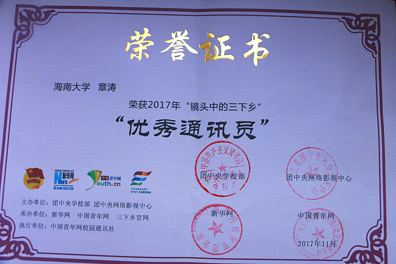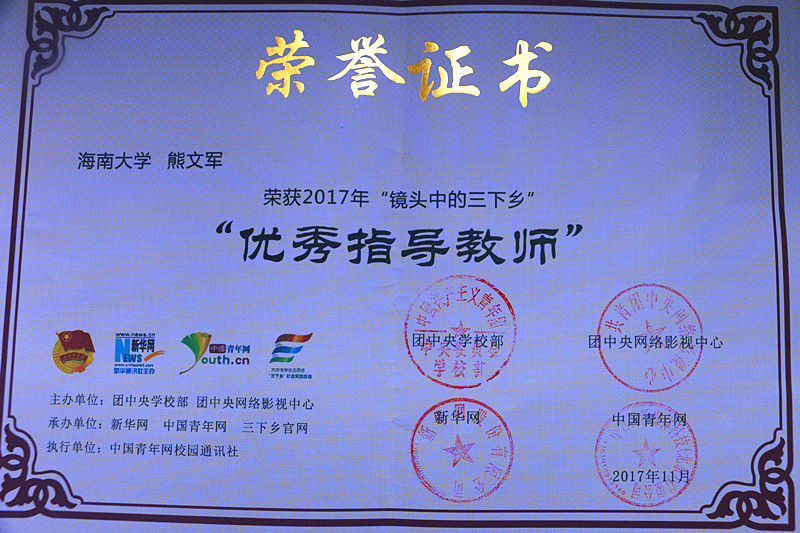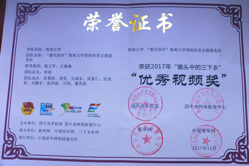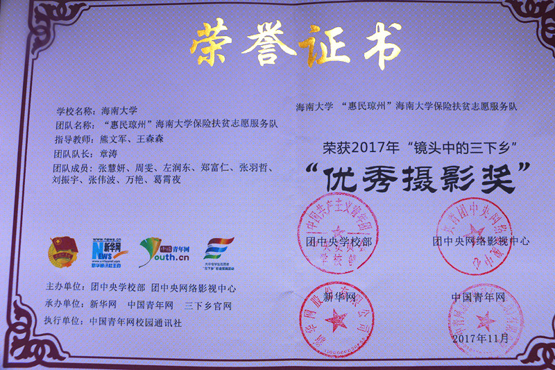 保险扶贫志愿服务队获评“优秀视频奖”、“优秀摄影奖”,团队队长章涛同学获“优秀通讯员”,团队指导教师熊文军获“优秀指导教师”荣誉称号。