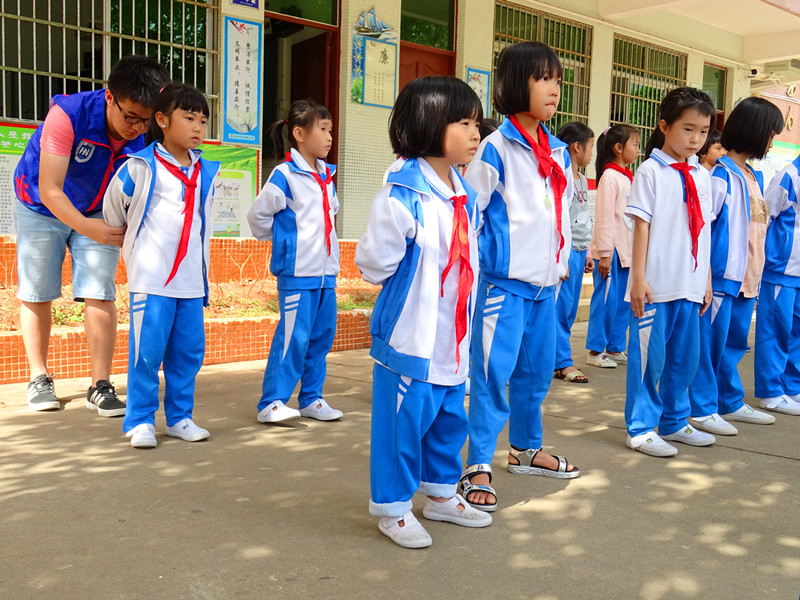 由三名志愿者担任教官,分别负责三个年级的军训教学。准备就绪后,教官们对各自管辖的年级发出集合指令,待孩子们集合完毕,一声哨响,军训正式开始。