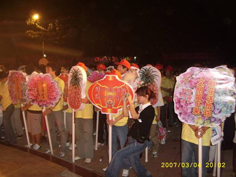 八点整,整个活动正式启动,台上主持人-我们学院的马旭佳、黄艳青两位同学话音未落,台下观众早已把整个广场围了个水泄不通。欢呼声、掌声、叫喊声与音乐一起合成一曲美妙的和谐乐章。随着主持人一声令下,十个花灯队伍按方阵的队列浩浩荡荡地出发了。志愿者们高举着倡议“文明换花”的彩灯,手捧着束束鲜花走向行人中去。台上主持人与观众进行妙趣横生地知识问答游戏,笑料百出,其乐无穷。幸运观众答对问题还可以获得一只鲜花得到一份祝福并能享受免费海口一日游。整个活动高潮迭起,台下观众个个摩拳擦掌跃跃欲试。直到我们的活动宣告结束依然有许多观众久久不愿离去,还有一些好奇的群众仍然向我们的广场走来看个究竟。