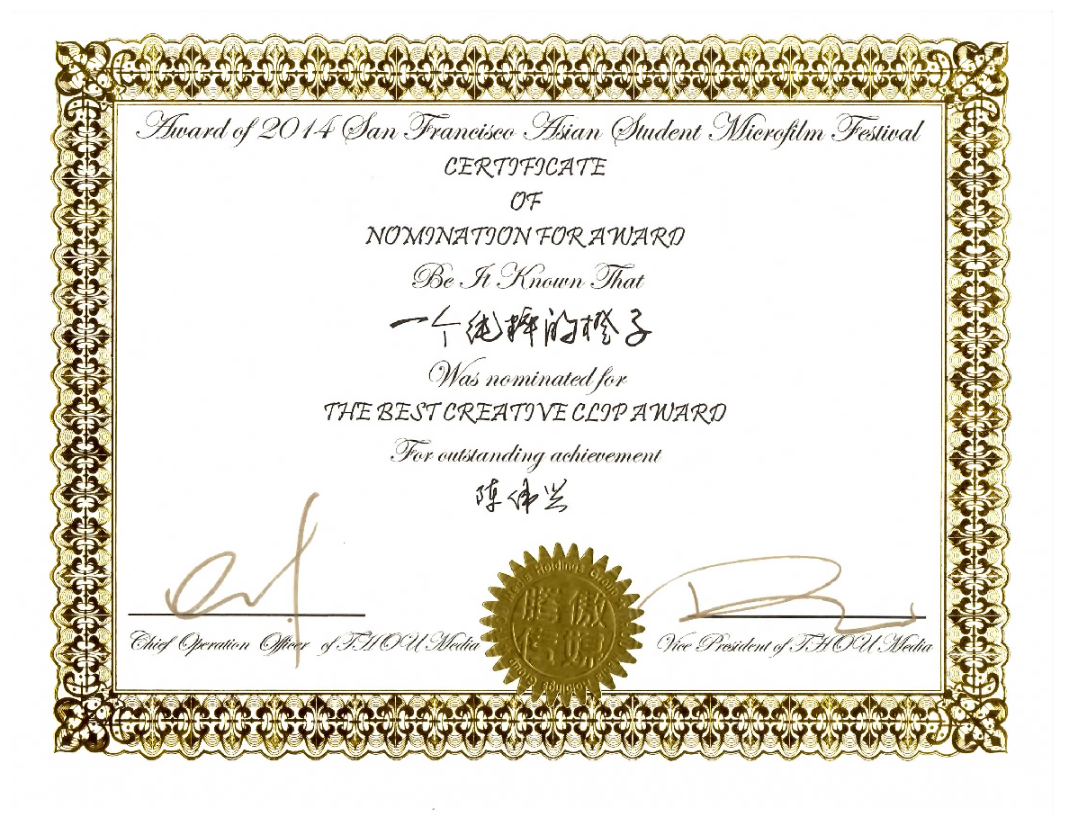 新闻与传播学系“学以致用、以用促学”的教学理念。在得知陈伟兴同学获奖后,新闻与传播学系系主任何晶娇老师和该系毕研韬教授向陈伟兴同学表示祝贺并鼓励其再接再厉。 旧金山亚洲学生微电影节,是由中国教育国际交流协会文化教育创意研发中心顾问指导。面向全球征集作品,是一个国际性的评选,在组委会征集的数百件作品中,不仅有来自中国传媒大学,中央美术学院等中国高校的作品,更有加纽约电影学院,南加州大学等美国高校和学生组织选送的作品。此次活动旨在创造国际性平台,推广学生文化交流,发掘年轻人创意及才华。是一个集展映、交流、评比於一题的微电影主题活动。包括微电影大赛、微动画大赛、微剧本大赛等竞赛单元。有50名优秀奖获奖名额、18项微电影节奖项。颁奖典礼在美国旧金山举行。 比赛链接://thoumedia.com/microfilm/2nd/%E3%80%8A%E4%B8%80%E5%80%8B%E7%B4%94%E7%B2%B9%E7%9A%84%E6%A9%99%E5%AD%90%E3%80%8B/