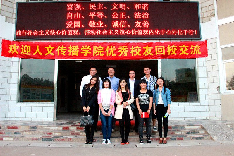 2012届广告系校友杜盼盼目前担任海南富力房地产开发有限公司策划部主任,在交流会中深情回顾了自己的大学生活。曾经担任学院团委学生副书记的她告诫2014级同学们,在大学里学好专业的同时也要积极参加团学等组织,提高自己与人沟通能力和组织协调能力。2008届中文系校友史小兵目前担任格力集团海南分公司行政部部长兼工会主席,向同学们强调了发掘自我的重要性,并向同学们推荐了心理学书籍《九形人格分析》。他稍后又为同学们分析了当前的就业形势,并提出了“职业发展有不同选择,自己要把握好选择权。” 2011届中文系校友臧会彬目前为《国际旅游岛商报》记者,2014届广告系校友姜天渭目前担任海南瑞思文化传播有限公司总经理(创业),两位校友在和同学们分享了自己的从业心路历程后,也都为同学们提出了如何规划未来职业的宝贵意见。