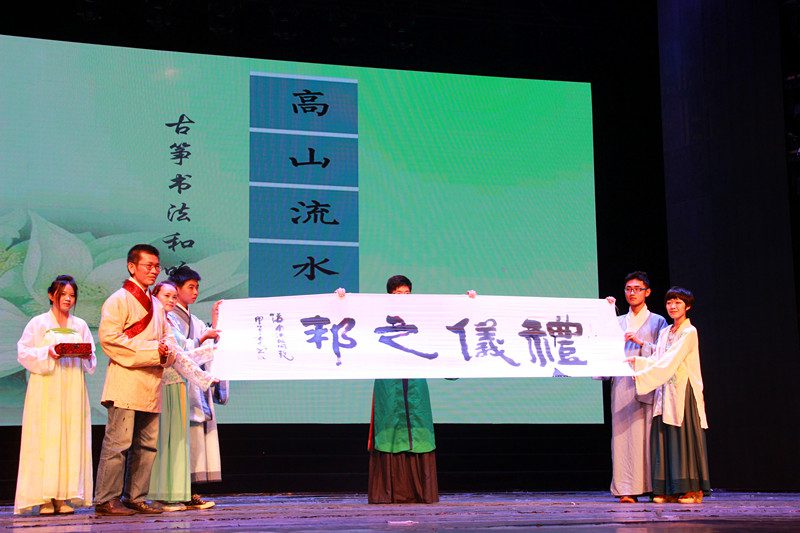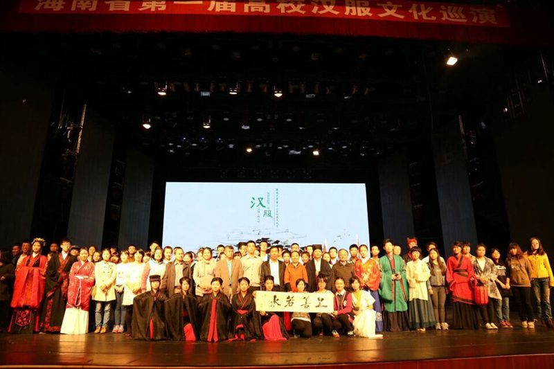 团委副书记黄小鸥、人文传播学院党委副书记孙晓媛、人文传播学院陈传汉老师、北师大校友会梁慕卿和来自泰国的访琼团。活动旨在通过汉服巡演弘扬中华传统文化和礼仪。 在庄严震撼的开场舞《礼仪之帮》节目后,由本次活动的发起者李榮老师发表讲话,他提到了汉服复兴运动近年来的发展,同时也指出这次活动目的是通过华美的服饰发扬华夏文化礼仪,实现华夏民族复兴和中国梦。接着由“衣云裳”汉服社推出了汉服秀《有衣,云裳》,通过走秀的形式将曲裾,直裾,襦裙,短打,直裰等汉服不同形制的实物向观众一一展现。紧接着来自海南各高校的汉服社团也表演了各自的精品节目,如舞蹈《惊鸿舞》、《风雅》、《长恨歌》和舞台剧《孔雀东南飞》等。演员们精彩的表演将巡演的气氛推向一轮又一轮的高潮。在书法与古筝节目《高山流水》后,主办方将写有“礼仪之邦”四字的墨宝赠予了泰国访琼团。在互动环节中,通过汉服知识问答抽取了四名幸运观众进行汉服试穿。在被问到穿着汉服的感受时,体验者说,他感受到了庄重的仪式感和深厚的文化积淀。晚会最后展示的是周制婚礼,婚礼流程包括亲迎、交拜礼、对席礼、沃盥礼、共牢合卺、合卺礼、解缨结发和执手礼。“桃之夭夭,灼灼其华。之子于归,宜其室家。”这场周制婚礼给观众们带来了别开生面的感受,使观众们被传统礼仪文化深深打动。第一届海南高校汉服巡演?海大站至此圆满落幕。 着我华服,扬我汉礼。汉服复兴运动在全国兴起已经十年左右,海南高校汉服巡演顺应着国内汉服运动的发展,拉近了高校大学生和传统文化的距离,使高校学生对传统服饰礼仪有了较为详细深入的了解,为中华优秀传统文化的复兴贡献出了自己的力量。