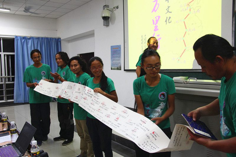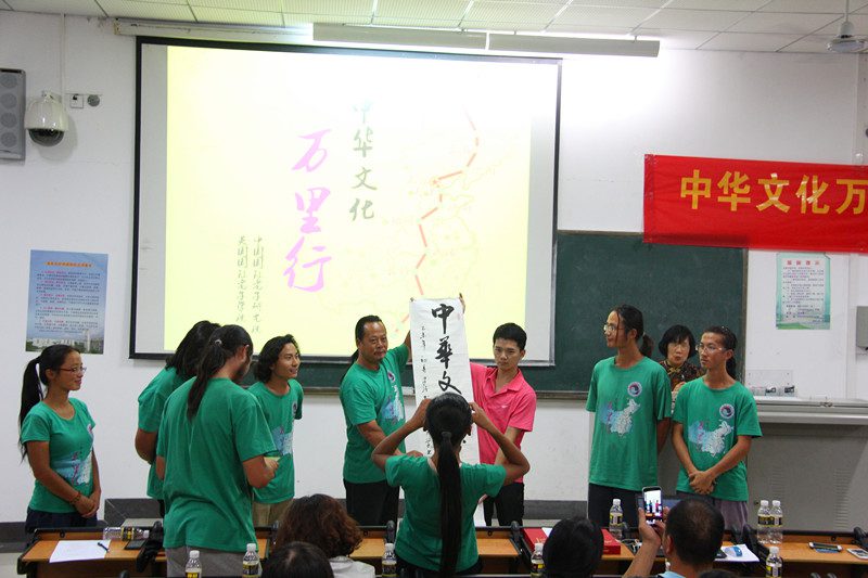 书法协会的学生代表向中华文化万里行团队赠送了一幅书法作品,表达了他们对中华文化万里行团队的支持和赞扬,同时也表明了作为传承中华文化的学生社团,他们一定将书法文化精神发扬出去。 据了解,中华文化万里行是由中国国际老子研究院和英国国际老子学院共同发起的一场文化远行。师生十人从漠河出发,以徒步的方式,经12个省份,一百多个市县,行程12520华里,将于十天以后到达行程终点海南三亚。 中华文化万里行团队一路上响应习近平总书记“文化强国”的号召,以弘扬中华优秀传统文化为己任,用实际行动的方式“寻中华文化之根,聚中华文化之魂,圆中华文化之梦”