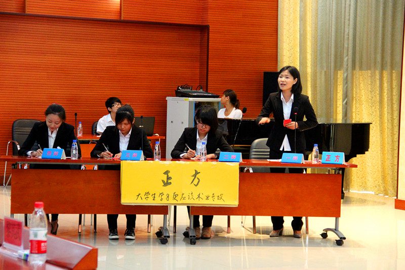 在主席宣读比赛规则和注意事项以后,比赛激烈开赛。本场比赛的辩题为“大学生应该术业专攻还是应该博学多识”。女同做爱