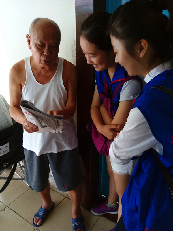清早便下着淅沥沥的雨,让人感觉到些许凉意,但丝毫没有影响志愿者们向老年公寓前进的步伐。八点四十分左右,志愿者们顺利抵达老年公寓。志愿者与老人们渐渐熟络后开始给老人们按摩、读报,同老人聊天,为老人表演才艺……公寓里很快热闹起来。在其乐融融的氛围中,一位爷爷引起了大家的注意。爷爷头顶的那顶红星军帽成了公寓里一道亮丽的风景线,这也让我们知道爷爷是个有故事的人。而后,爷爷充满激情地给志愿者讲起了当年的革命故事。最让我们动容的是爷爷对肩章的呵护,他把肩章用打了结的黑色袜子和塑料袋包着,稳稳的放在胸口前的口袋里,当爷爷小心翼翼地掏出给大家看时,我们看到了一位革命老兵珍贵的记忆。当志愿者提出能否合照时,老人欣然同意,面对镜头,他伸出右手颤颤巍巍地敬礼,饱经沧桑的脸上露出自豪的笑容。每位老人都有自己的故事,而我们是那一群愿意用心去聆听故事的人。