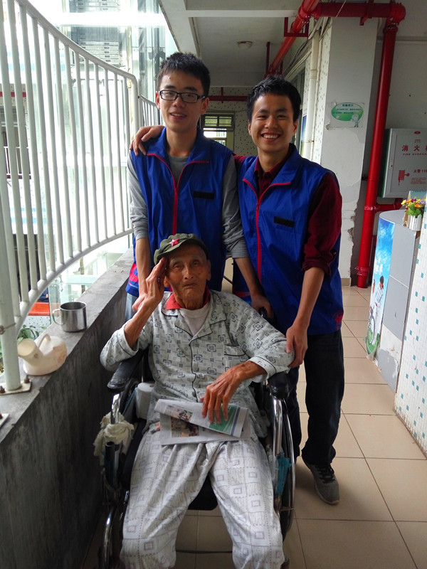 活动当天,天气晴朗,远远就看见有许多老人在院子里晒太阳。志愿者们有礼貌地上前向爷爷奶奶们问好,很自然地为他们捏腿捶背。这样普通而又温馨的场景,总能给人的内心带来触动。有一位身形瘦小的老爷爷坐在房间的门口,若有所思地向远处望着。一名志愿者主动上前给老人捏肩,与老人聊天。当记者问及志愿者参加这个活动初衷时,“不想让这里的老人感到孤独”,志愿者很朴实简单的一句话,却一点点地融化了在场每个人的心。而在另外一个房间里,不断地传出《西游记》的主题曲,一位老爷爷高兴地随着音乐哼着歌。这位老爷爷已经107岁了,但志愿者谈到这位爷爷时都说他说话时声音洪亮,看起来精神饱满,一点也不显老。公寓里的每个老人都有自己独特并且可爱的地方,也总是能带给志愿者不同的感动。