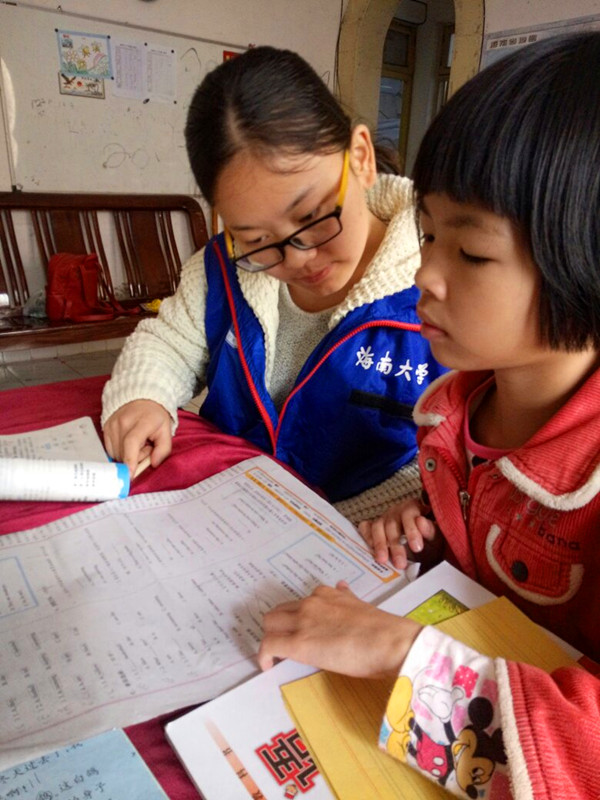 志愿者为孩子检查作业