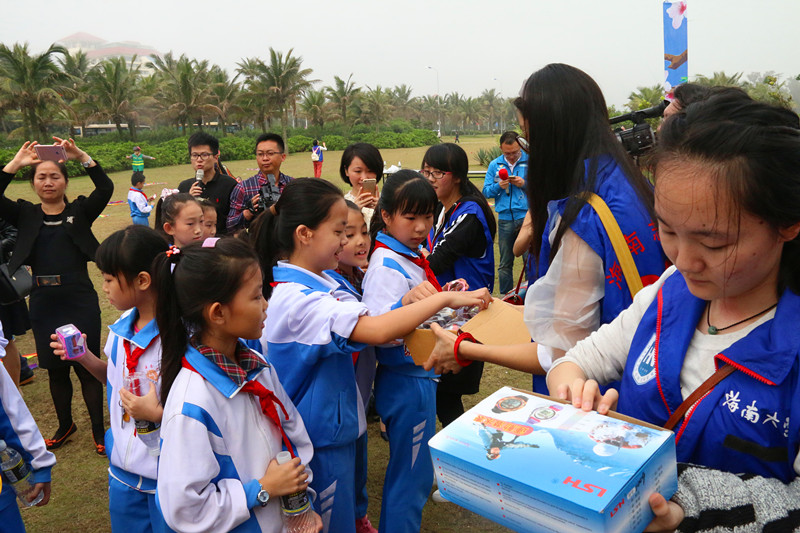 志愿者为少先队员发放礼品