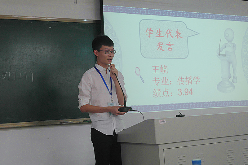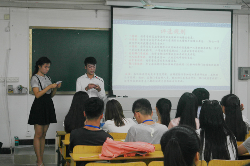 开展了学生干部“优秀学风奖”的评选活动。在参会人员回顾了团学青一年的工作和生活之后,大会正式开始,由熊文军老师致开场词。熊老师希望全体学生干部都能处理好工作和学习的关系,并送上他深切的祝福与期盼。在熊老师应邀下,学生会秘书处前秘书长,现保研于四川大学的12级戏剧影视文学的高娜学姐现场分享她的学习经验:“第一,要努力学习,提高绩点;第二,每个阶段都要有一个目标;第三,要博览群书,做一个有学识的人。”高娜学姐的精彩讲话让全场热情高涨,掌声连连。