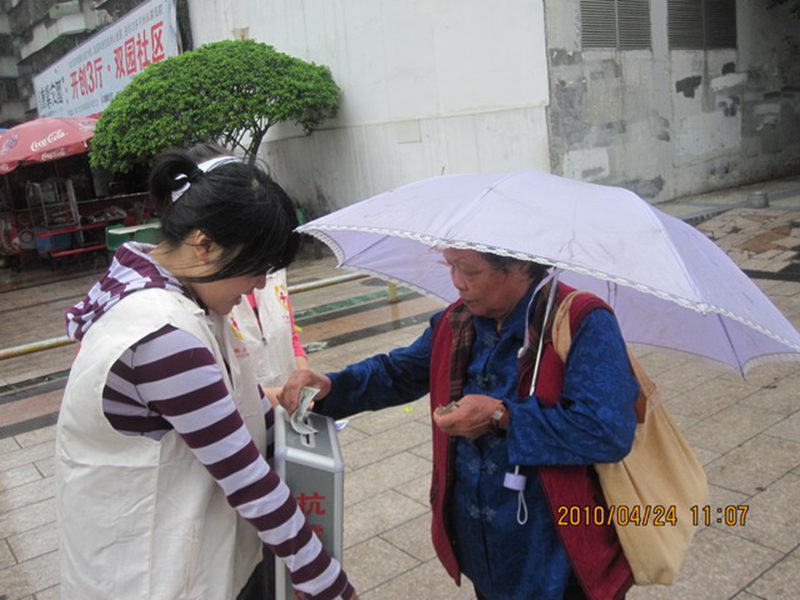 活动的主要地点在明珠广场和万国大都会。同学们抱着募捐箱,走向街头,向路过的行人进行募捐,并向捐款人贴上象征对受灾地区同胞哀思的黄丝带。捐款的人有垂暮的老人,有朝气蓬勃的青年,有小朋友,甚至还有三个高中生主动请缨帮忙募捐。即使在中午的蒙蒙细雨中,市民们仍坚持捐款。每一份捐款都值得我们表达深深的敬意,每一份捐款都是一份浓浓的爱心。
