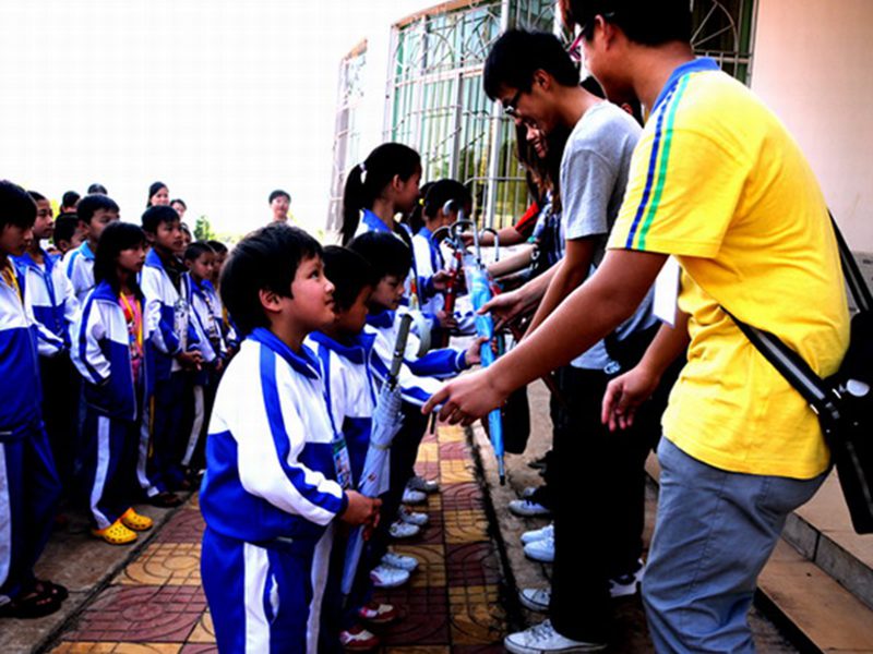 人文传播学院爱心捐赠”字样的爱心伞发放到孩子手中。看着孩子们有些渴望又有些羞涩的望着爱心伞,一个个接过伞并礼貌的说声:谢谢,志愿者们心里升起了由衷的快乐和欣慰。仪式结束后,大家同校领导以及老师们一同合影留念,此次捐赠活动圆满结束。