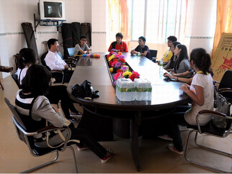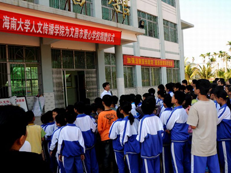 在校图书馆,校长李传宝热情地把我们请进了会议室,为我们做了爱心学校的介绍并与我们商量了捐赠仪式的相关事宜。从李校长口中我们得知,虽然文昌爱心学校里近一半的学生是孤儿,但接受良好的教育是他们的权利,爱心学校要让他们获得与普通孩子一样的教育,他们应该得到更多的关怀,这些年在社会各界的帮助和多方捐赠下,学校的教育水平和硬件设施都取得了质的飞跃,让更多的孤儿因此获益。同时,李校长也提出了他的忧虑,学校里很多孤儿自幼便失去了父母。因为从小缺乏父母的关爱,他们对生活存在着很多的迷惘,性格上有一些孤僻,相比物质帮助,他们更需要精神上的开导和心灵上的鼓励。他非常希望来自周边大学的学生能够经常来到爱心学校,与这里的孤儿进行交流,帮助他们从走出心灵的阴影,树立个人理想和对大学的向往。