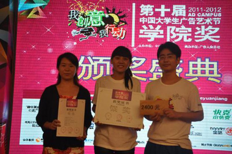 2009级广告郑杨、谢文彬、李秉彝与2009级中文余欣蓉共同创作的网络广告《那些年,我们穿什么》,喜获网络类银奖,何晶娇老师荣获优秀指导奖。 中国大学生广告艺术节简称“学院奖”,是目前国内唯一由国家工商总局批准、中国广告协会主办的大学生广告艺术大型活动。经过多年成功探索,目前“学院奖”已成为广告、营销、传播、设计、新闻等专业最重要的专业奖项,也是行业遴选人才、企业获取创意的重要途径。