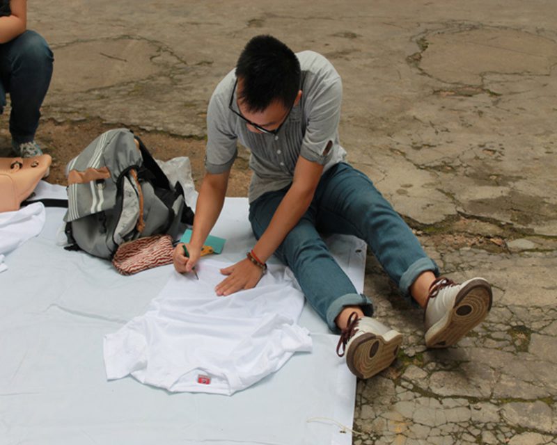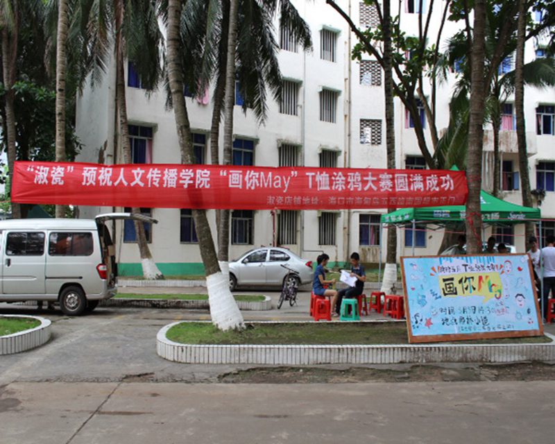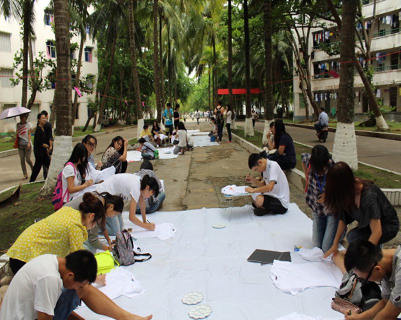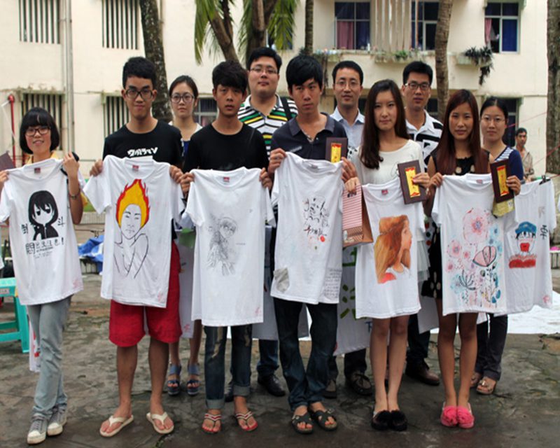 5月5日下午2点30分,由人文传播学院主办的以“画你MAY”为主题的T恤设计大赛在校椰林小道成功举办。人文传播学院团委学工办公衍峰老师、王森森老师、熊文军老师、王俊延老师、陈坤峰老师、以及院学生会主席韩啓雄均参加本次活动。 活动还未开始,就有许多同学提前到达,进行相关的活动报名,生怕错过本次大赛的机会。两点半活动准时开始,在工作人员清点参赛人数后,参赛人群每五人一组分配到不同地点设计自己的DIY作品。不久之后,大雨突然袭来,不过突如其来的大雨丝毫也没有打消参赛者的热情。不时有同学冒雨前来参加现场报名,雨中涂鸦。天公作美,3点30分左右,天空放晴,T恤设计大赛继续开始。参赛者纷纷在椰林小路上继续自己的创作。截止到5点30分活动结束,共有来自6个学院的约50名参赛选手在规定时间上交作品,经过几位老师和参看同学的集中投票,分别产生了本次涂鸦大赛的一二三等奖,学院团委学工办的几位老师分别为获奖选手颁奖,本次T恤设计大赛取得圆满成功。 本次T恤DIY设计大赛增强了女同做爱