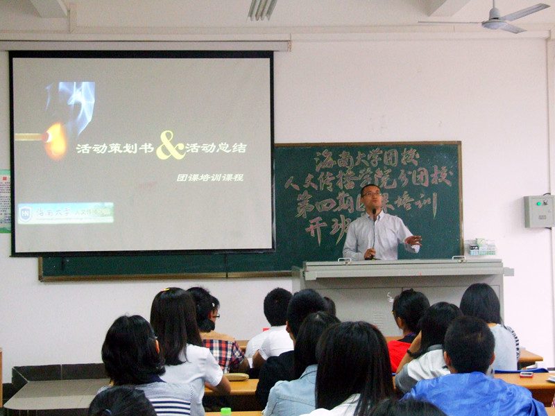 团校人文传播学院分团校第四期团学干部培训开班典礼暨培训第一讲在4-112进行。学工办公衍峰老师、熊文军老师、院学生主席李文杰、王忠莉、康墨扬出席分团校开班典礼。院学生团委副书记夏国淞主持开班仪式。 16时40分开班典礼正式开始。学生团委副书记夏国淞为典礼致开幕辞,紧接着全体起立,奏中华人民共和国国歌。之后,本期培训班学员代表党璇做了精彩发言,表达了学员们对本次培训班学习的期许和通过培训学习,不断提升自我能力的信心。最后,在全体学员共唱《五月的花海》的团歌声中开班典礼顺利结束。主持人宣布第4期团课培训班正式开班并进入团课第一讲。第一讲邀请到院学工办公衍峰老师为学员们主讲活动策划书和活动总结的撰写。公衍峰老师为学员们细致的讲解了策划书撰写的方法和内容,并以学院学生活动为例,就如何写就一份内容完整,合乎规范的的策划书提醒了同学们应该注意的地方。在讲解活动总结时,公衍峰老师强调活动举办后,活动举办部门应该写好活动总结,并归类整理。公老师以实例方式的讲解给团学各部门负责人就如何严密的办好活动提供了很好的经验借鉴。 据了解,为了更好的提升我学团学组织活力和团学干部的工作业务能力,营造和谐团学大家庭的氛围,本期团校培训将开将以室内理论课和户外素质拓展构建课程设置,让学员在理论学习和集体拓展中不断获得提高和进步。