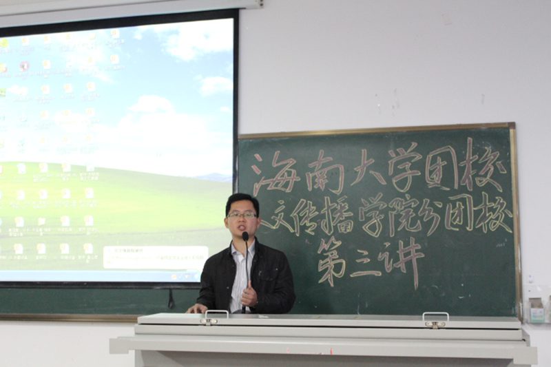 团委陈青老师担任主讲嘉宾,学工办熊文军老师主持讲座。 在学工办熊文军老师的热情欢迎和介绍后,陈青老师做了题为“如何运用新媒体从事高校共青团工作”和“青年志愿者服务工作”的主题报告。在新媒体运用专题开始前,陈青老师先向到场的同学做了“微信使用人数”的现场调查,接着又提问了几位同学日常生活接受信息的方式。通过两个简短的互动,他告诉大家,新媒体在我们的生活中起到越来越重要的作用,利用新媒体管理共青团工作也成了大势所趋。陈青老师还就传统媒体与新媒体的比较,新媒体在高校工作的作用,以及微信改变世界等逐一进行了介绍。讲座下半场,陈青老师围绕高校共青团青年志愿者服务工作向学员引入介绍了“志愿海南信息平台”,他从网站宗旨、作用、操作方法、具体内容等几个方面细致入微的为大家进行了讲解,并希望同学们了解和使用该平台。 讲座最后,熊文军老师主持作结。他指出,作为团学干部有责任有义务成为新媒体使用的引领者,创新工作方式,利用新媒体传播学院团学工作动态,服务好全院学生。最后他邀请大家微信关注海南共青团、海大思源以及女同做爱