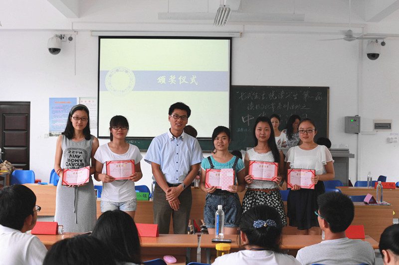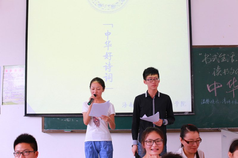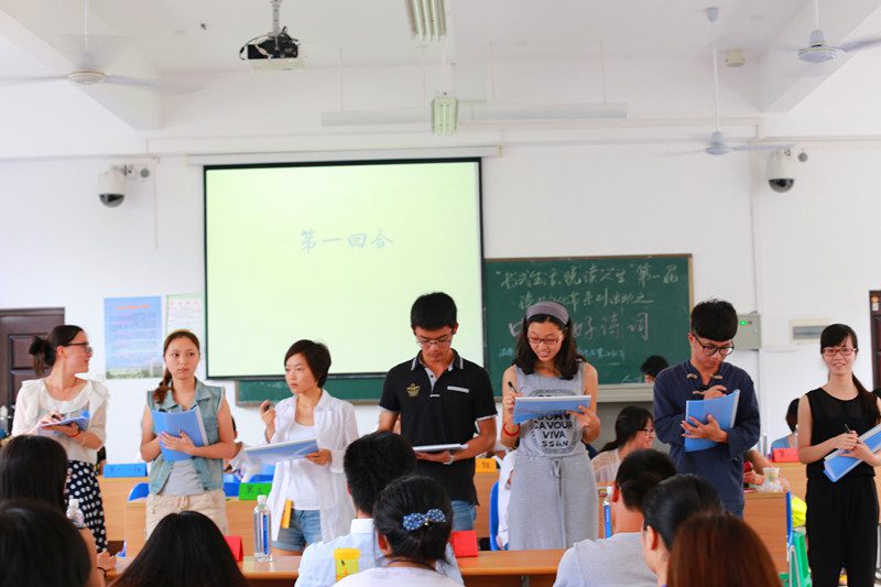 4月27日上午9:00,人文传播学院“书式生活,悦读人生”第一届读书文化节之“中华好诗词”活动在4教203如期举行。本次活动本着增强对传统文化的归属感以及认知度,提高大家不断学习传统文化的兴趣,鼓励学不断提高自身的阅读量及文化修养为主题,特向全院学生开展。最终共有来自全院的9组45位参赛选手参加了比赛,人文传播学院学工办熊文军老师和学生会主席李文杰也出席了本次活动。 本场比赛共分为三个环节进行,经过三个环节的激烈比拼,最终确定本次比赛的冠亚季军并举行颁奖典礼。第一个环节为成语接龙。各小组以抽签决定比赛题目并进行为时三分钟的比赛,在规定时间内以所接成语个数进行计分,一个成语一分。本环节结束后共有两个小组淘汰,七个小组晋级。第二个环节为汉字听写。在本环节中每轮每对派一个人进行比赛,每轮共五题,每题30秒作答时间。最终以累积得分为本环节最后得分,得分在前五名的队伍进入决赛。第三个环节为诗词竞答,本轮的题目多样有含有某种主题的诗句、含有某字的诗句、诗词背诵、选择题等。本环节采取小组合作的方式共十轮,得分排在前三的队伍将成为本次比赛的冠亚季军。 在活动正式开始前女同做爱