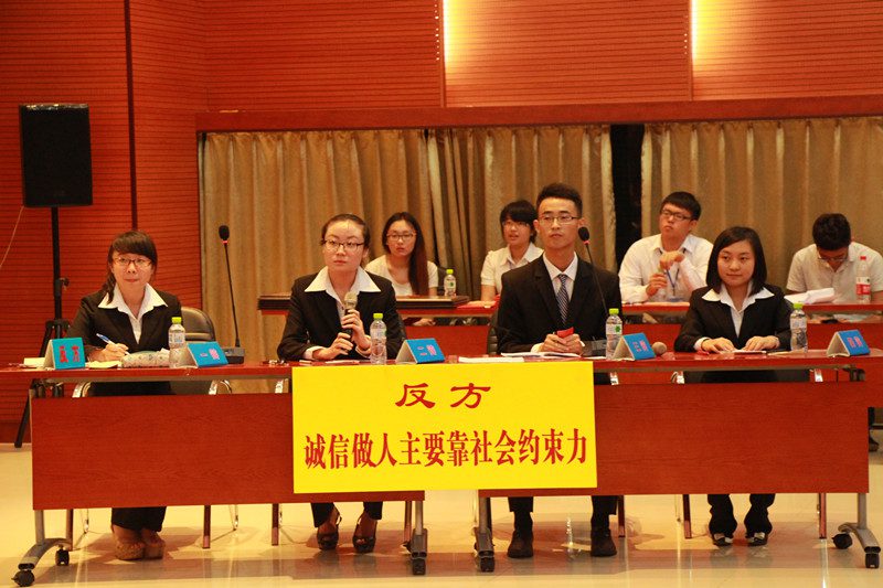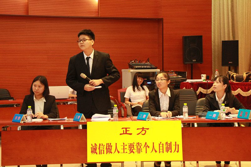 辩论队加油助威。 决赛对阵双方分别是正方应用科技学院(城西校区),正方观点:诚信做人要靠个人自制力。反方人文传播学院,我方观点:诚信做人要靠社会约束力。在主席亲切的介绍了到场评委老师和嘉宾以及双方辩论队自我介绍后,决赛之战正式拉开帷幕。首先正方进行了开篇立论,正方认为诚信做人应该依靠个人自制力,人的内心主宰着人的一切行为。只有从内心上想做一个诚实守信的人,他在可能真正成为诚信的人。接着我方进行了开篇立论,我方提到,约束力顾名思义。约是一种社会准则和契约,束是通过法律这一硬性条件和道德观念这一软性条件对人的诚信进行塑造。只有这样才能使更多的人,用最有效的方式到达诚信。在攻辩和自由辩环节,双方紧抓时机,展开了针锋相对的辩论,局势激烈,讨论深刻。双方激烈的讨论,巧妙的解答,精准的论证也不时赢得了在场观众的阵阵掌声。最终经过各位评委老师的离席集中评议,我方以3:2战胜队友成功夺得了女同做爱