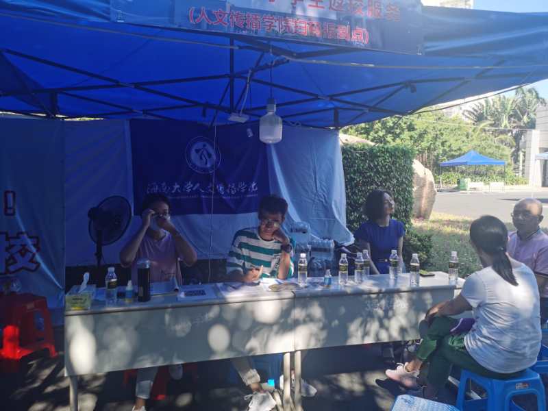 九月入秋,海南依旧还是盛夏,从全国各地回校的学子们再次踏上这片土壤,开启他们新的生活。受疫情影响,老生返校也与以往有所不同。为配合国家防疫战略、保障学校学生和教职工的生命安全,凡是返校者均需要在入校门前进行测量气温、消毒等工作。9月3日到9月6日,学生志愿者在海口高温的天气下持续重复着这些检查工作,尽职尽责地工作。另外,学院党委负责人邱华祥、学院党委副书记罗邻球、全体辅导员及2020级班主任来到迎生大本营处迎接老生并视察工作,以保证学生返校活动顺利进行。