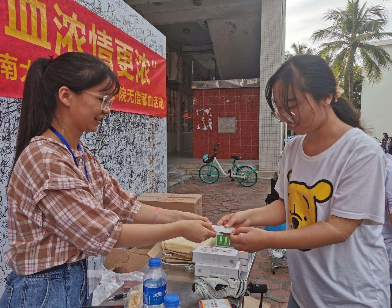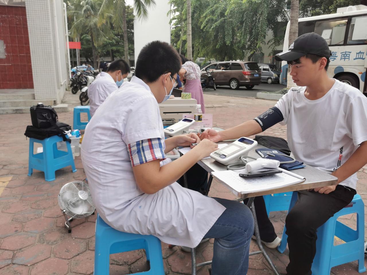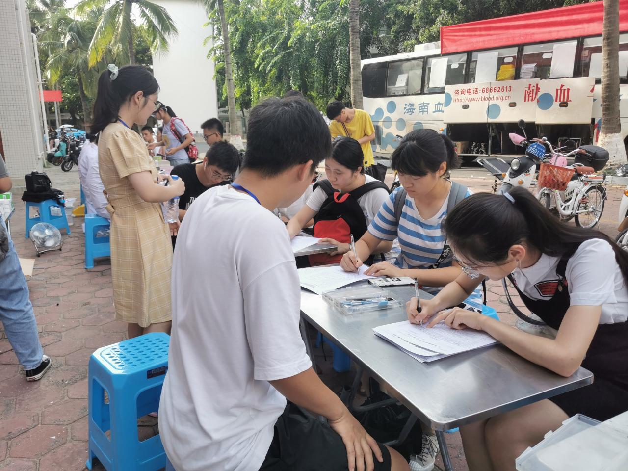 海甸校区二食堂门前顺利开展。在学院青年志愿者协会带队人员的组织下,五名志愿者到达活动场地,协助海南省血液中心开展本次活动。