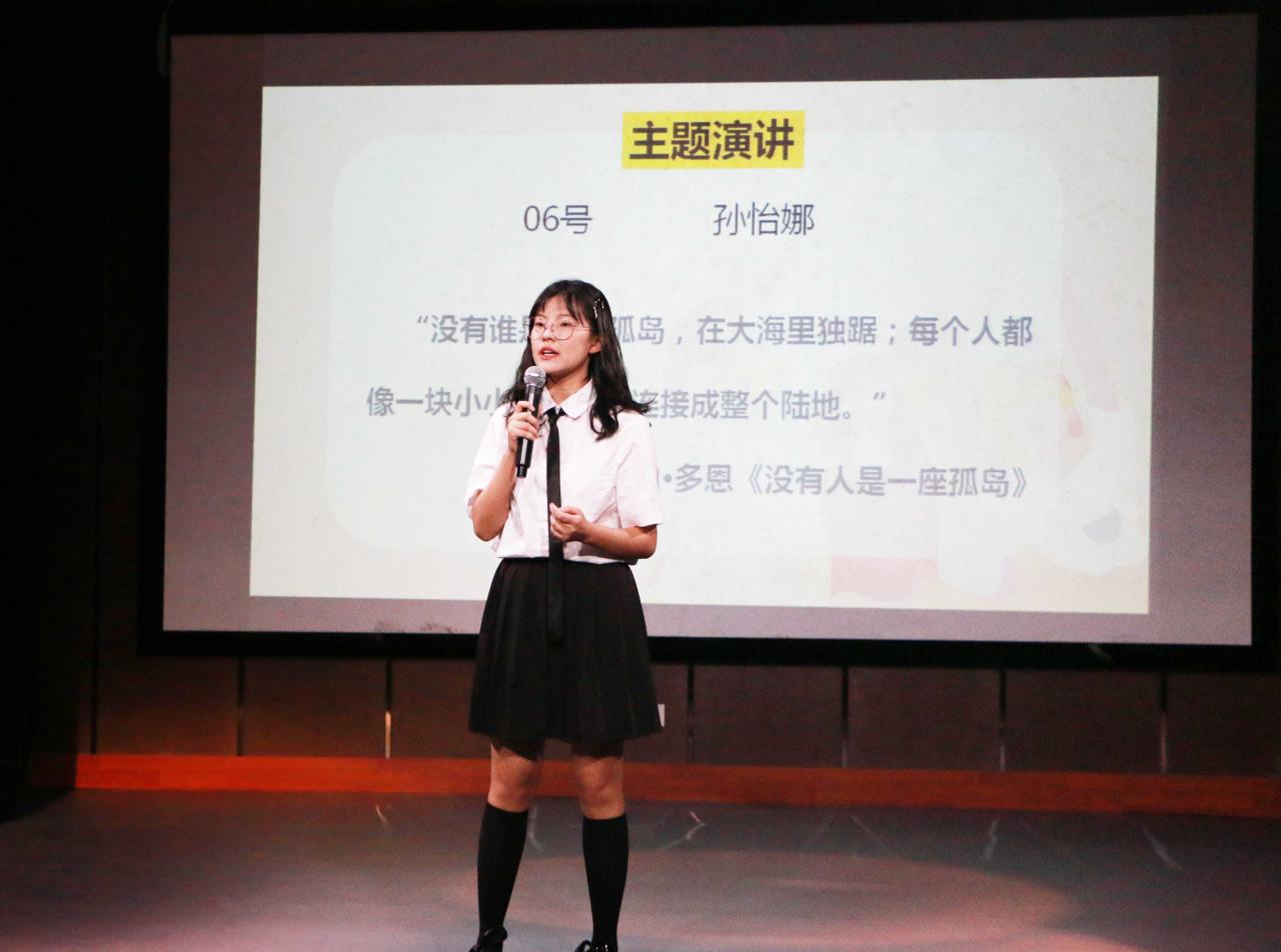 比赛正式开始,第一位上场的是杨婉莹同学,她以特蕾莎修女为例,讲述了"善良是联系他人的前提”的中心思想。一位位选手按抽签顺序依次上场,以大屏幕上的PPT为自我介绍的窗口,以声音为连接观众的纽带,带领观众享受了一场心灵盛宴。