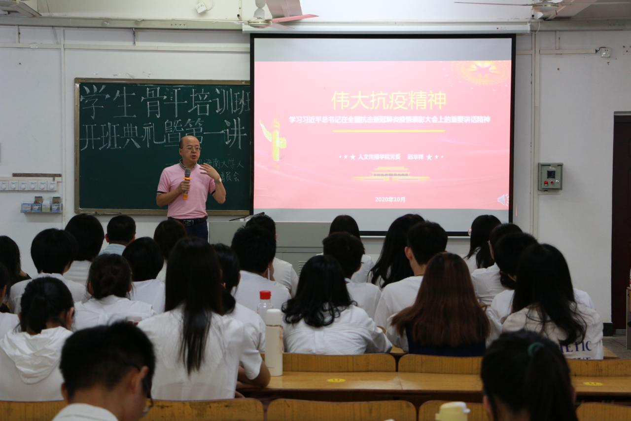 开班仪式后,党委负责人邱华祥以“伟大的抗疫精神”为主题,为全体学员讲授“习近平总书记在全国抗击新冠肺炎疫情表彰大会上的重要讲话精神”。他从“回顾抗疫斗争重大战略成果”、“五方面阐述抗疫‘制胜密码’”、“五个词诠释伟大抗疫精神”、“抗疫斗争伟大实践的六大深刻启示”和“不断开创党和国家事业发展新局面”五大板块阐述伟大的抗疫精神。他在讲座中融会亲身经历和社会现象,联系历史和当代国际形势,鼓励青年学子们善用自己的专业知识,发挥才干,勇担责任,服务国家,为我国精神文明建设作出贡献。同时,他从当代大学生的角度出发,希望同学们能够在大学中重塑思想、强健体魄,成为祖国栋梁。