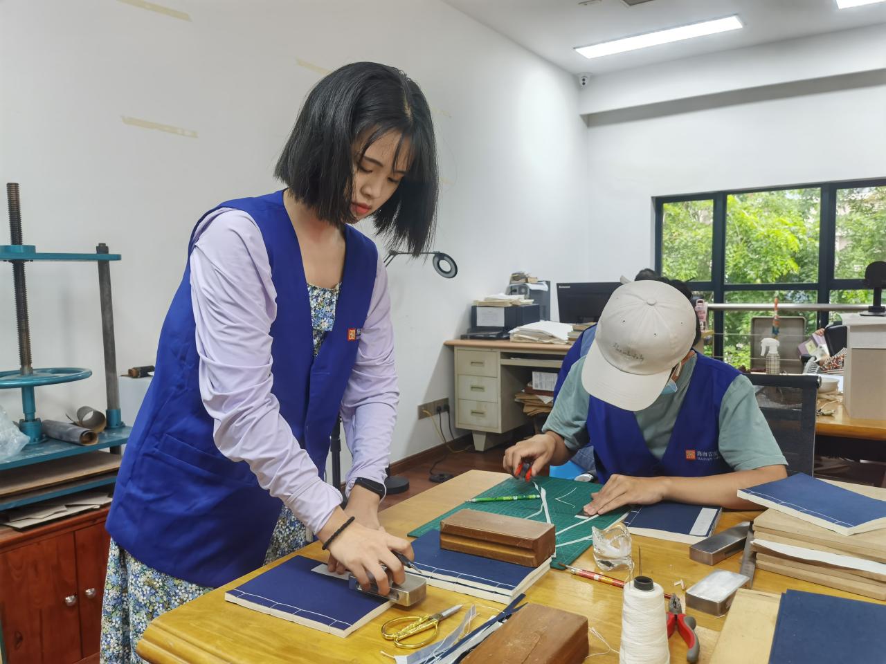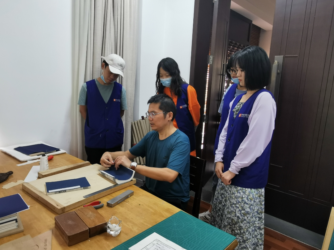 在此三期活动中,志愿者仍旧负责线装书的装订及古籍修复工作。通过前几期黄老师仔细地讲解和志愿者地实际操作,志愿者已十分熟悉相关的线装工作。在线装工作中,志愿者首先熟练地使用木锤和细锥,按照适宜的比例在古籍本封页面打孔,随后使用细针按照一定顺序将白线穿入孔内进行装订,随后打结并将线头穿入孔内。负责古籍修复工作的志愿者则专心致志地在桌前用毛笔和修补纸进行修补工作。活动开展顺利且进行得井然有序。