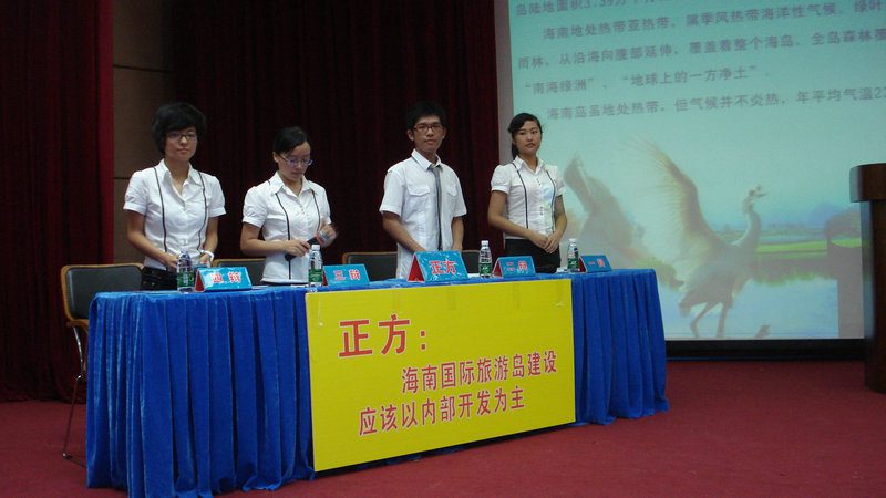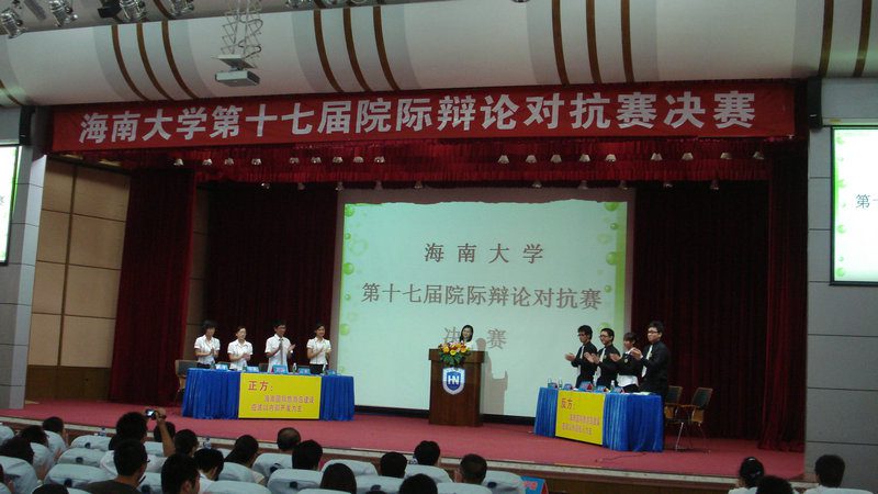 第十七届院际辩论赛决赛在学校行政楼2楼报告厅正式上演。人文传播学院文韬武略辩论队是比赛的正方,辩题为“海南国际旅游岛建设应以内部开发为主”。本次比赛的评委由健坤集团副总经理郭鑫先生、海南医学院团委符琬聆书记、女同做爱