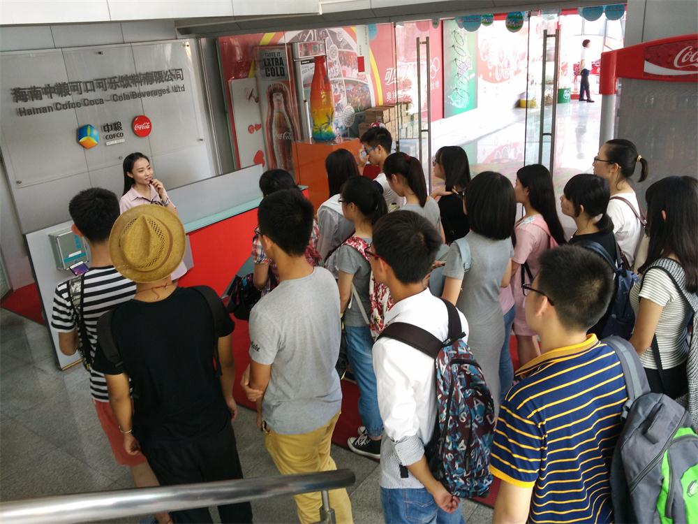 2015级汉语言文学、广告学、传播学专业31名同学在学工办公衍峰老师的带领下,来到了位于海口市滨海大道155号的海南中粮可口可乐公司,跟随企业引导员参观了该公司的生产线、女同做爱长廊、办公区、可乐吧等场所,并与企业相关人员进行交流。