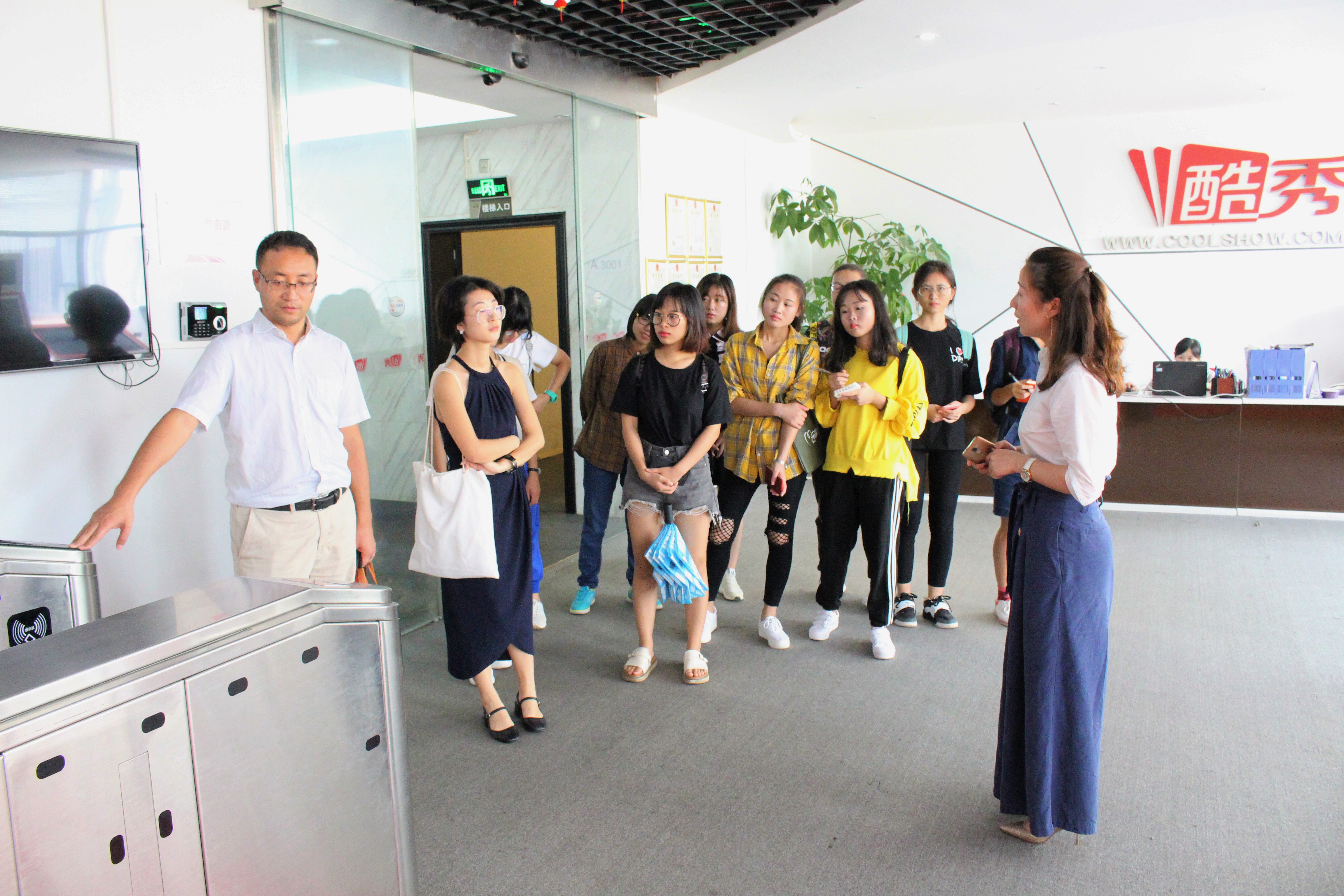 师生表示了热烈欢迎,然后带领同学们大致参观了会展公司的内部结构,详细讲解了各个部门的运营模式以及工作职责等基本情况,让同学们对酷秀集团的发展有了初步了解。