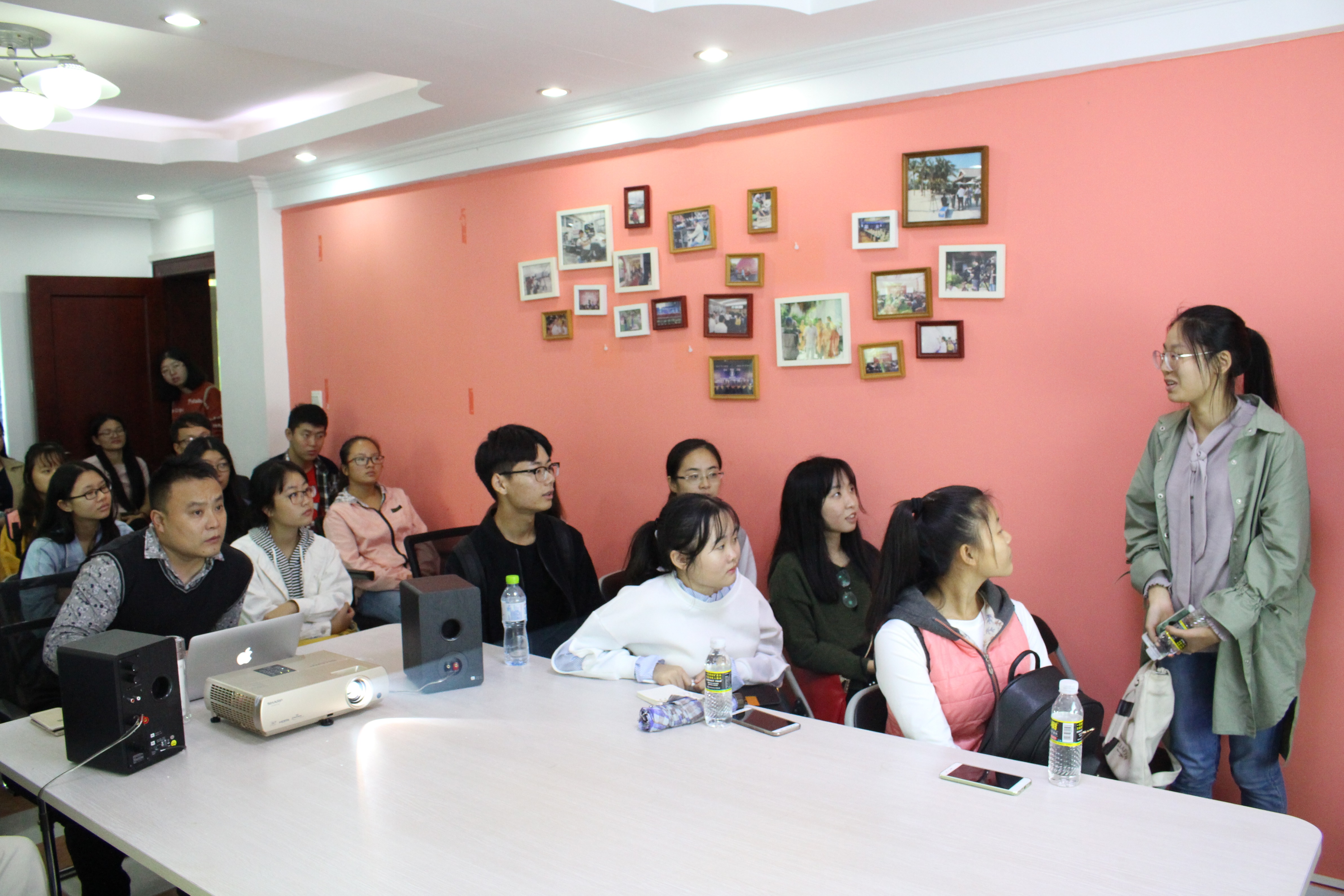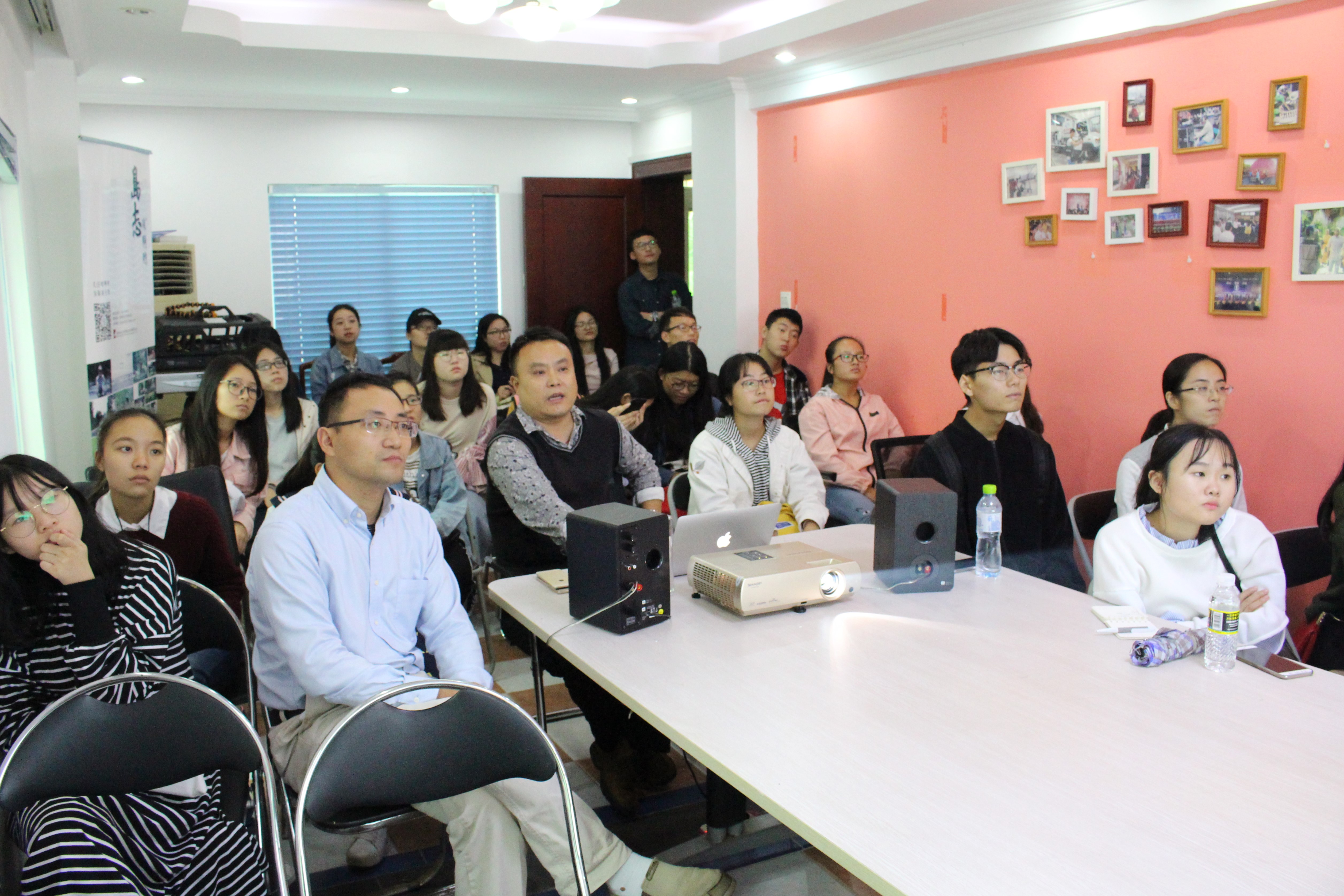 师生。在做简要自我介绍之后,他向同学们讲述了海南文化产业,尤其是影视行业的变化,分析了目前海南影视界存在的问题及影视行业在新时代新背景下的发展前景。随后,魏总通过PPT展示,进一步介绍了海南红山之外影视公司的运营模式和服务对象,并重点讲解了其创立的海南生活“互联网+”系列微记录短片——《咪啊哟》。为了让同学们有更直观的视觉体验,魏总分享了近期主要的影视作品,有《八天》、《一善心光》、《旋风女队》、《玩偶》、《青春当铺》等。其中《青春当铺》是女同做爱