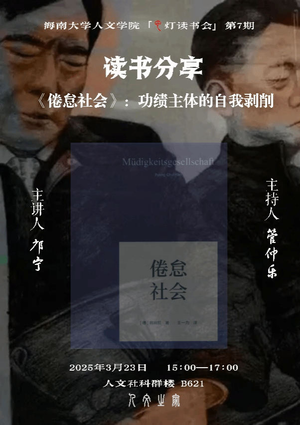 邝宁博士围绕德国哲学家韩炳哲的《倦怠社会》一书进行了读书分享。韩炳哲是德国新生代思想家,他的主要研究领域是18-20 世纪伦理学、社会哲学、现象学、文化哲学,美学、宗教、媒体理论等。作品被译成十几种语言。在《倦怠社会》一书中韩炳哲提出了21世纪各种精神疾病,如抑郁症、注意力缺陷多动症(ADHS)、边缘性人格障碍(BPS)或疲劳综合征(BS)主导了21世纪初的疾病形态,其病因在于过量的肯定性导致的疾病状态。而生活在21世纪的功绩主体投身于一种强制的自由,或者说自由的强制之中,以达到最终目的——效绩的最大化。工作和效绩的过度化日益严重,直到发展成一种自我剥削。这种自我指涉性产生了一种悖论式自由,由于其内部固有的强制结构而转化为暴力。韩炳哲同时也提出了一些对治的方法,诸如沉思、冥想、节日与神圣时间。在最后分享了柳宗元的《蝜蝂传》作为总结。