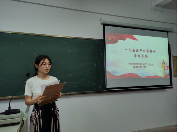 11月27日下午,人文传播学院研究生第二党支部召开党员大会,深入学习贯彻十九届五中全会精神,会议由第二党支部书记宋鸽主持。