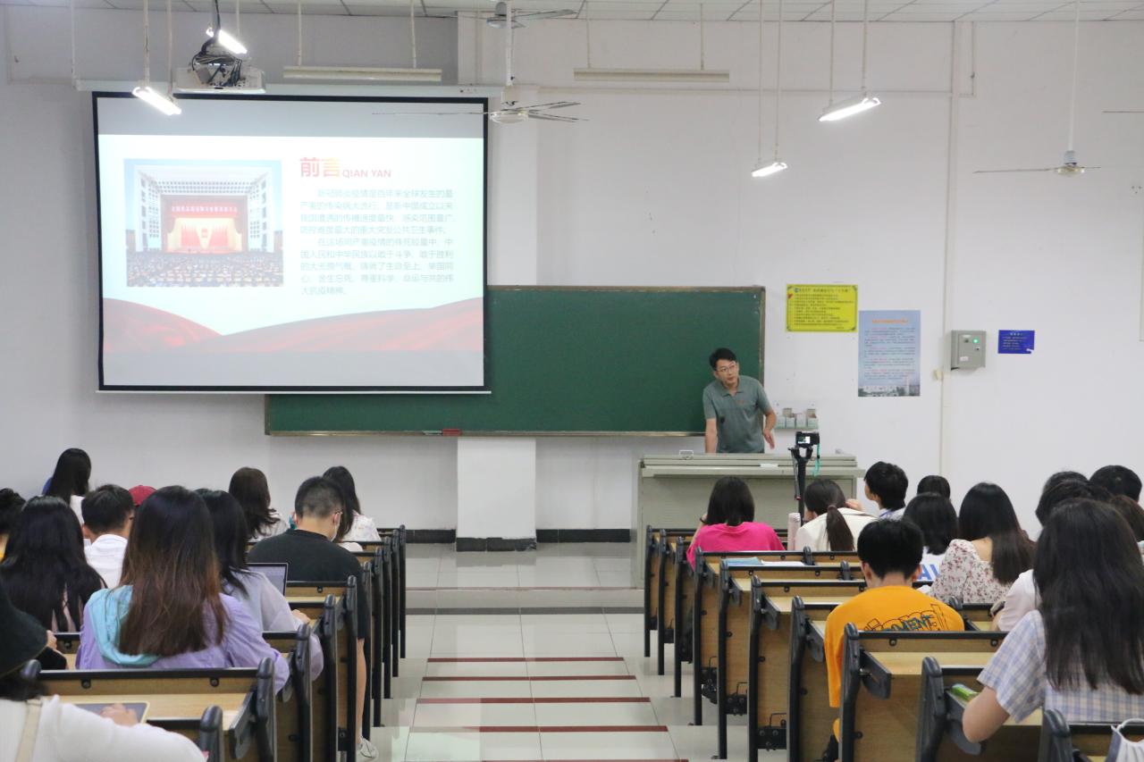 在课上,戈旭伟老师向大家详细介绍了疫情的相关背景和中国当前取得的抗疫成果,新冠肺炎疫情是百年来全球发生的最严重的传染病大流行,是新中国成立以来我国遭遇的传播速度最快、感染范围最广、防控难度最大的重大突发公共卫生事件。在这场同严重疫情的殊死较量中,中国人民和中华民族以敢于斗争、敢于胜利的大无畏气概,铸就了生命至上、举国同心、舍生忘死、尊重科学、命运与共的伟大抗疫精神。同时,戈旭伟老师系统地讲述了中国抗击新冠疫情的五大阶段——应对突发新冠疫情、初步遏制疫情蔓延势头、本土新增病例下降、取得武汉保卫战、湖北保卫战决定性成果和全国防控进入常态化。